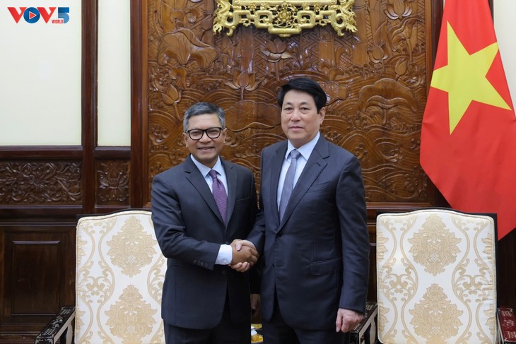 ប្រធានរដ្ឋវៀតណាម លោក លឿង គឿង ទទួលជួបឯកអគ្គរដ្ឋទូតឥណ្ឌូនេស៊ីប្រចាំនៅវៀតណាម លោក ដេននី អាបឌី ។ រូបថត៖ VOV