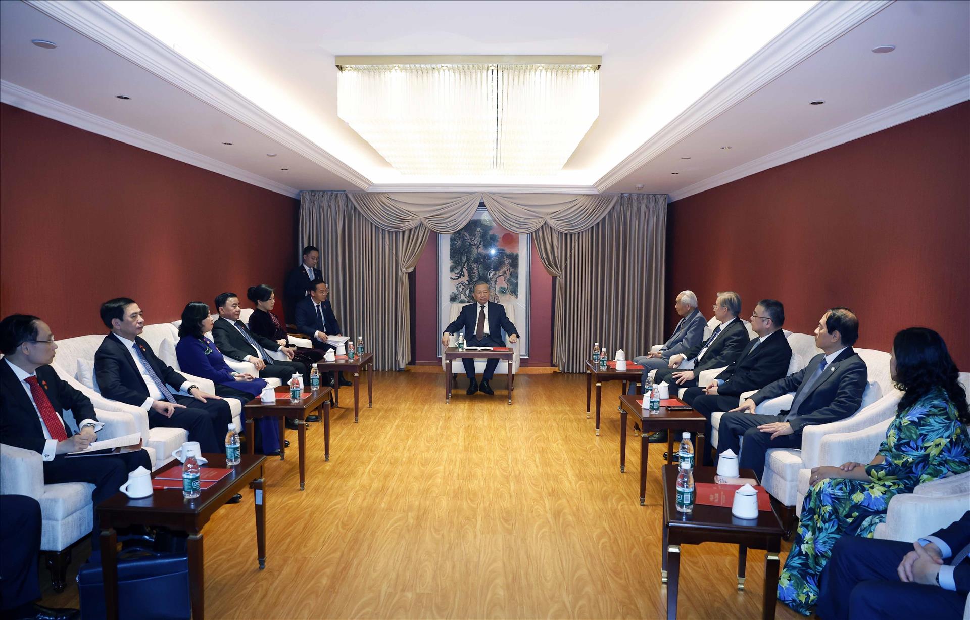 អគ្គលេខាបក្ស ប្រធានរដ្ឋវៀតណាម លោក តូ ឡឹម និងភរិយា បានជួបសំណេះសំណាលជាមួយសាច់ញាតិរបស់បណ្ដាឧត្តមសេនីយ៍ អ្នកជំនាញ និងបញ្ញាវ័ន្តមិត្តភាពវៀតណាម-ចិន។ (រូបថត៖ VNA)