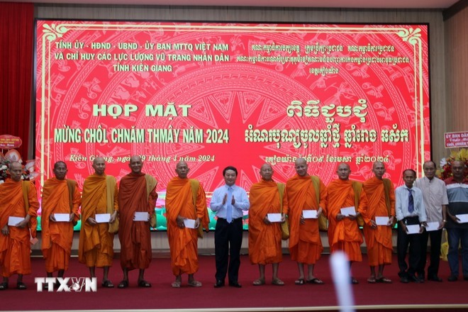 ថៃទី ៩ មេសា ខេត្ត Kien Giang បានរៀបចំពិធីជួបសំណេះសំណាលអបអរសាទរបុណ្យចូលឆ្នាំថ្មីប្រពៃណីរបស់បងប្អូនជនរួមជាតិខ្មែរ។ អញ្ជើញថ្លែងនៅទីនេះ លោក Hau A Lenh រដ្ឋមន្ត្រី ប្រធានគណៈកម្មាធិការជនជាតិបានសង្កត់ធ្ងន់ថា៖ ដោយមានការយកចិត្តទុកដាក់របស់បក្ស និងរដ្ឋ ខេត្ត ក្រុងនានា ការចែករំលែក និងការជួយឧបត្ថម្ភរបស់សហគមន៍នោះ សេដ្ឋកិច្ច សង្គម និងជីវភាពរស់នៅរបស់បងប្អូនជនរួមជាតិខ្មែរមានការវិវឌ្ឍថ្មី ជីវភាពខាងសម្ភារៈ និងស្មារតីរបស់បងប្អូនជនរួមជាតិត្រូវបានលើកកម្ពស់ ហើយមុខមាត់ជនបទកាន់តែល្អប្រសើរឡើង។