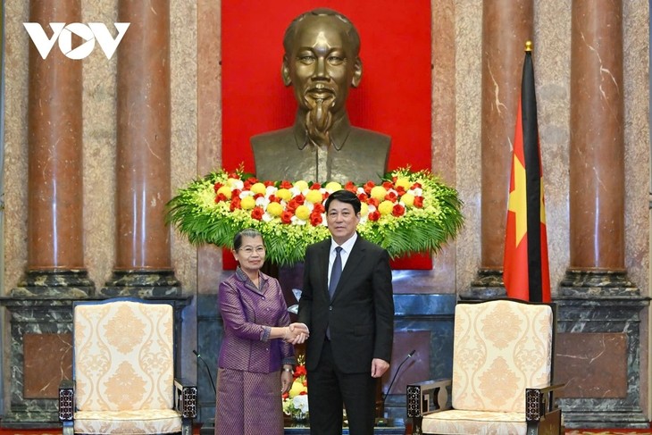 ប្រធានរដ្ឋ លោក លឿង គឿង អញ្ជើញទទួលជួបលោកស្រី ម៉ែន សំអន អនុប្រធានគណបក្សប្រជាជនកម្ពុជា ប្រធានក្រុមប្រឹក្សាជាតិរណសិរ្សសាមគ្គីអភិវឌ្ឍន៍មាតុភូមិកម្ពុជា និងជាប្រធានសមាគមមិត្តភាពកម្ពុជា-វៀតណាម (រូបថត៖ Viet Cuong/VOV)