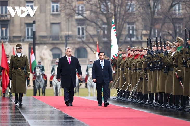 នារសៀលថ្ងៃដដែល នៅទីលានវិមានរដ្ឋសភាហុងគ្រីនៅរដ្ឋធានី Budapest នាយករដ្ឋមន្ត្រីហុងគ្រី លោក Viktor Orban បានអញ្ជើញជាអធិបតីក្នុងពិធីបដិសណ្ឋារ កិច្ចជាផ្លូវការស្វាគមន៍នាយករដ្ឋមន្ត្រីវៀតណាមលោក Pham Minh Chinh និងលោក ជំទាវ។ បន្ទាប់ពីពិធីទទួលបដិសណ្ឋារកិច្ច មេដឹកនាំទាំងពីរបានជួបពិភាក្សាការងារ ទ្វេភាគី ដើម្បីផ្លាស់ប្ដូរទិសដៅសំខាន់ៗ និងវិធានការជាក់ស្ដែង ដើម្បីលើកកំពស់ ទំនាក់ទំនងភាពជាដៃគូគ្រប់ជ្រុងជ្រោយវៀតណាម - ហុងគ្រី ឡើងកំពស់ថ្មី។