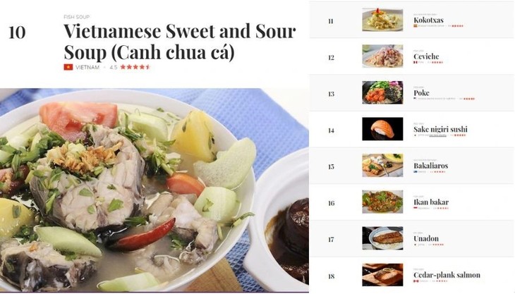 ជាប់ចំណាត់ថ្នាក់ទី ៥៣ គឺជាស៊ុបឆ្នាំងភ្លើងត្រីលីញជាមួយផ្កាស្នោ។ នេះជាមុខម្ហូបពិសេសដ៏ល្បីរបស់ខេត្ត Dong Thap ក្នុងរដូវទឹកឡើង ត្រូវបានធ្វើពីត្រីលីញ ដែលជាប្រភេទត្រីទឹកសាបក្នុងស្រុក និងផ្កាស្នោ៕