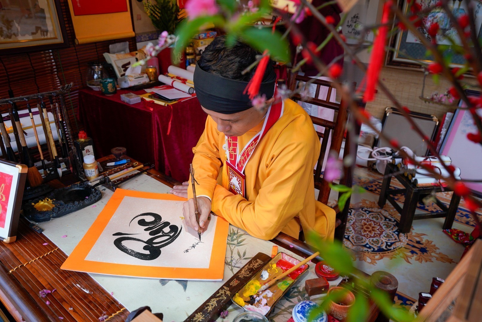 관광객들이 베트남의 설 맞이 ‘서예 글씨 받기(새해 소원 글씨 청하기)’ 풍습을 흥미롭게 체험하고 있다. 사진: 칸호아 - 베트남통신사