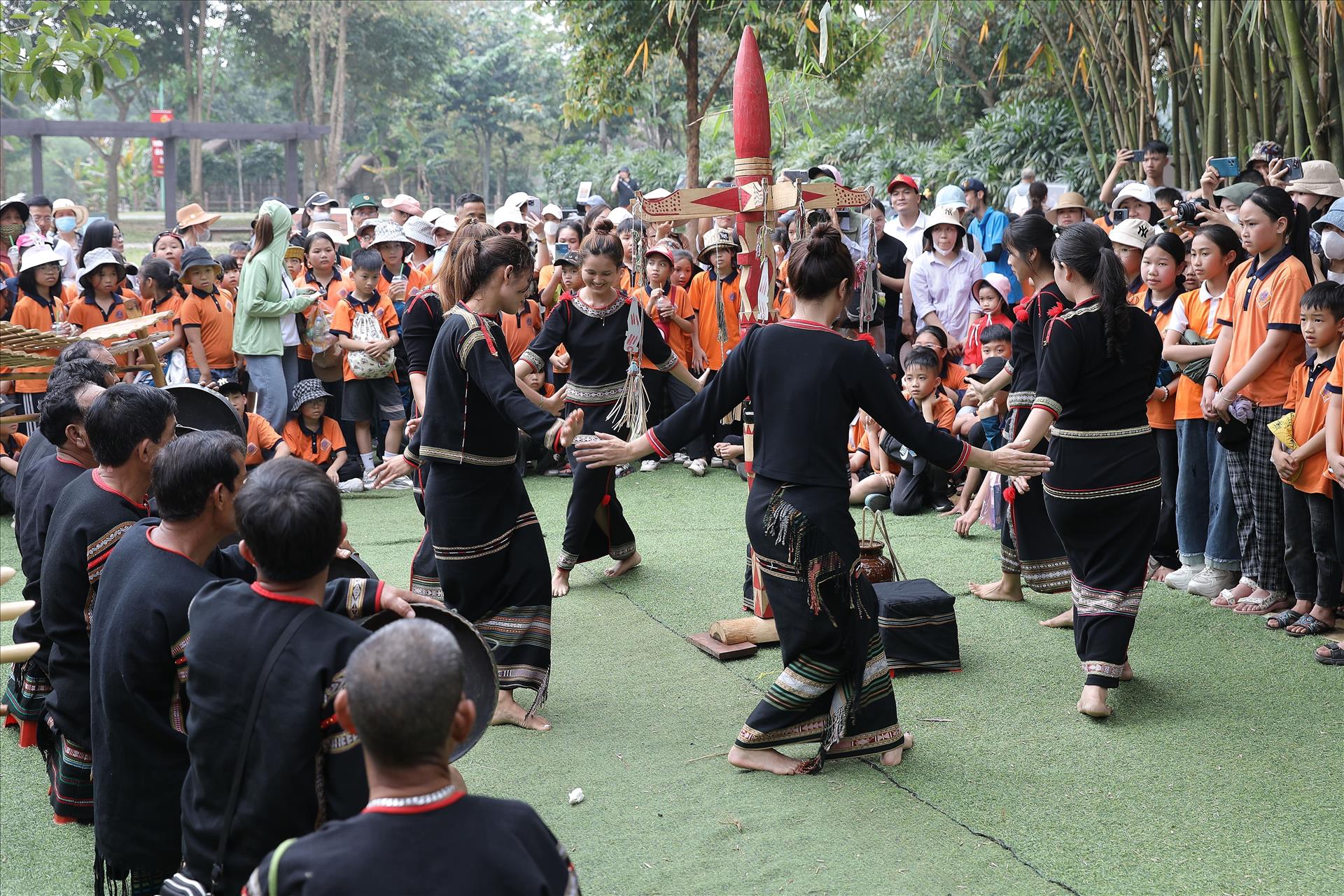 수많은 시민과 관광객들이 베트남 소수민족인 에데(Ê Đê)족의 성인식 현장을 찾아 축하 공연인 전통 민요와 민속 무용을 감상하고 있다. 사진: 레 동/ 베트남 통신사.
