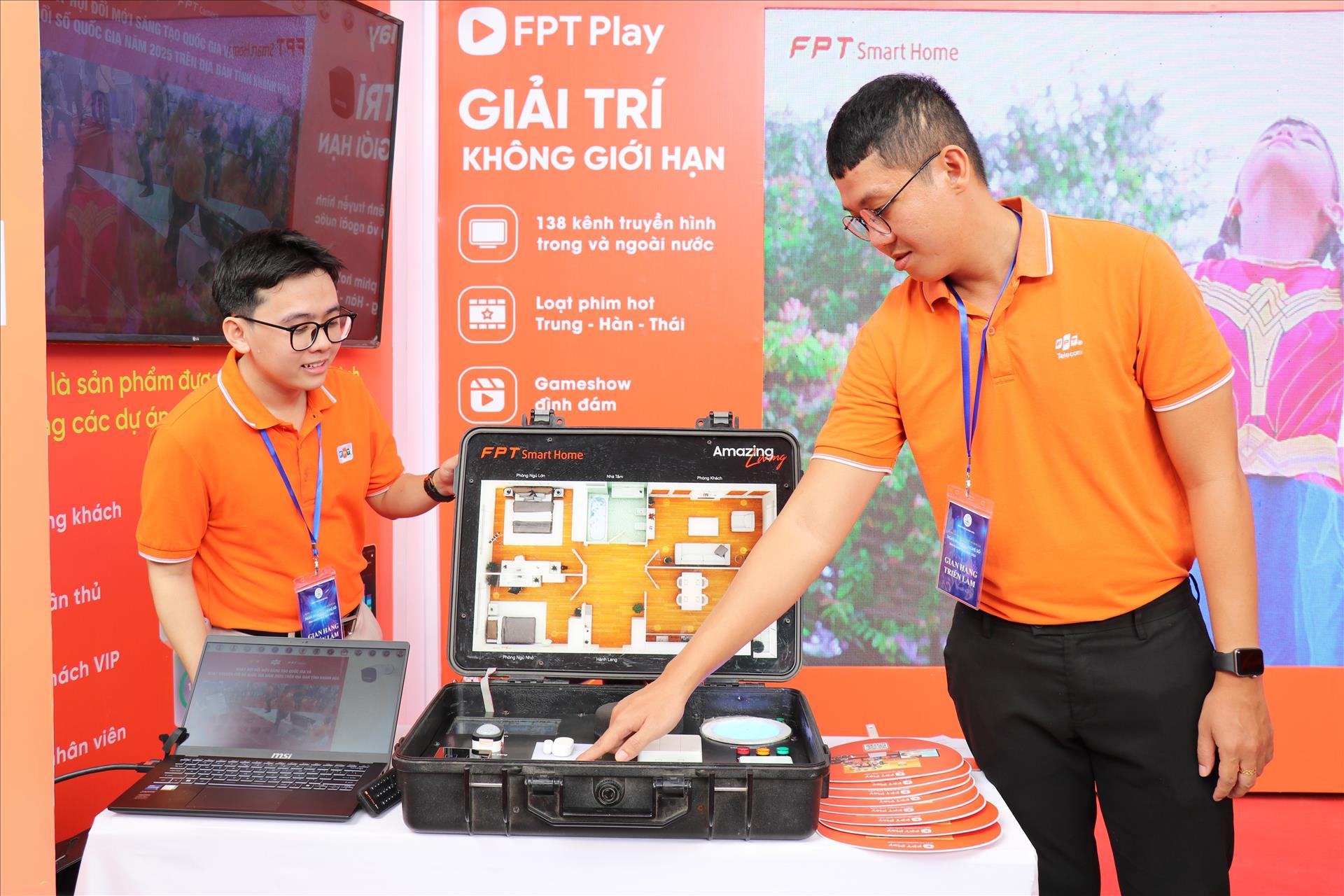 칸호아성 과학기술 행사에서 한 기업이 최첨단 스마트홈 솔루션을 시연하고 있다. 사물인터넷(IoT) 기술을 활용한 기기 간 연결과 자동 제어 서비스는 베트남 주거 문화의 디지털 전환을 상징적으로 보여준다.” 사진: 응우옌 타인(Nguyễn Thành) 기자 / 베트남 통신사