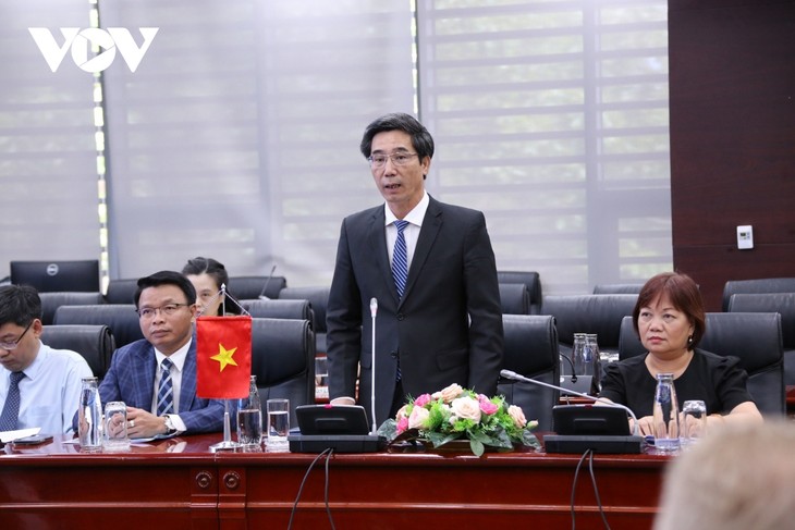지속가능하고 스마트 전략 인프라에 다낭과 스웨덴 간 협력 촉진 - ảnh 1만남에서 발표하고 있는 다낭시 인민위원회 쩐 찌 끄엉(Trần Chí Cường) 부위원장