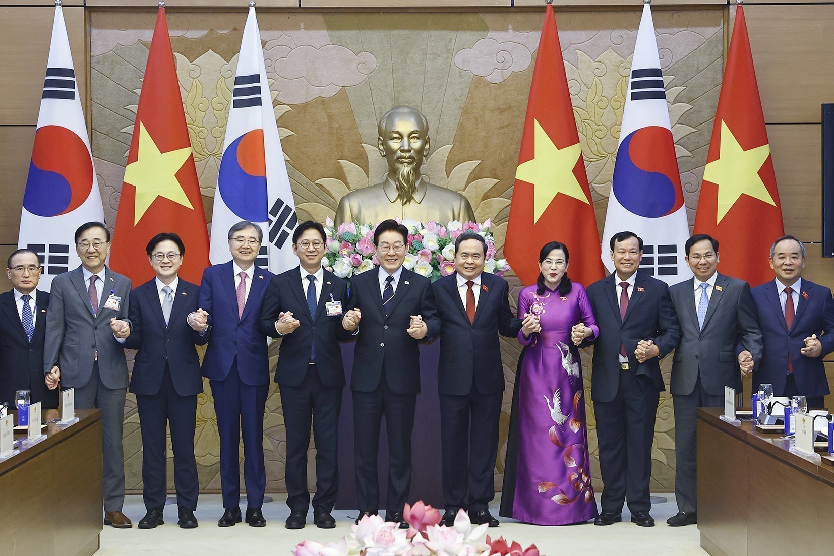 쩐 타인 먼(Trần Thanh Mẫn)국회의장은 23일에 베트남 국빈 방문 중인 이재명 대한민국 대통령과외 회견을 가졌다. 사진: 조안 떤(Doãn Tấn) - 베트남통신사