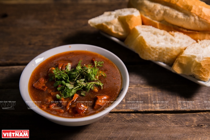 하노이 호안끼엠(Hoàn Kiếm)군 항봉(Hàng Bông)거리 252번지에 위치한 식당에서의 반미 솟 방(bánh mì sốt vang)음식 사진: 카잉롱(Khánh Long)