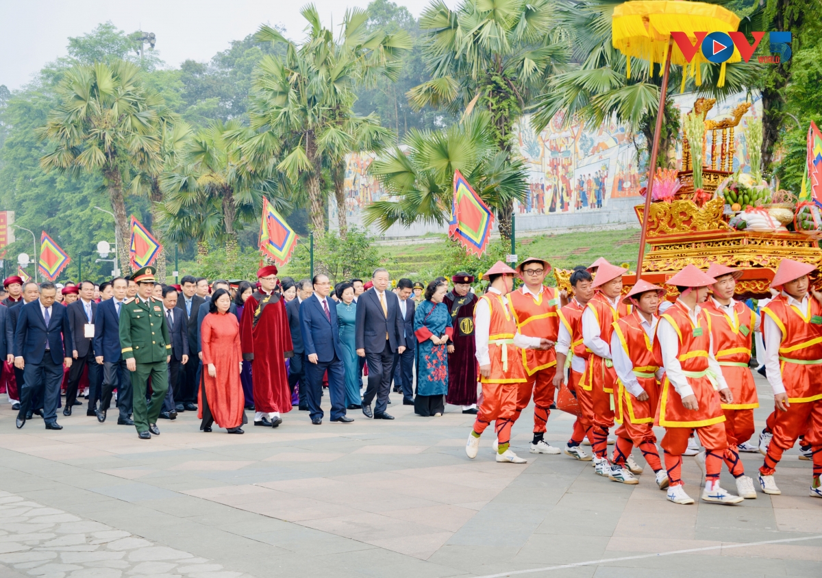이날 의장대는 ‘건국의 시조 훙왕의 은혜를 영원히 기억하리라’라는 문구가 적힌 화환을 들고 입장했다. 국기와 축제기를 든 의장대, 붉은 아오자이를 입고 향과 꽃, 제물을 든 소녀들, 전통 의상을 입은 100명의 ‘용의 자손, 선녀의 후예’인 베트남인들, 전통 악단, 가마 행렬 및 헌향단이 그 뒤를 이었다. 경천전에서 또 럼 당 서기장‧국가주석은 당과 국가, 지방 지도부와 함께 경건한 마음으로 향과 꽃, 제물을 바쳤다. 이는 건국의 시조인 훙왕과 나라를 세우고 지켜온 선조들의 공덕을 기리고, 후손들이 오늘날의 부강하고 문명한 베트남을 건설하는 전통을 이어가기 위함이다.