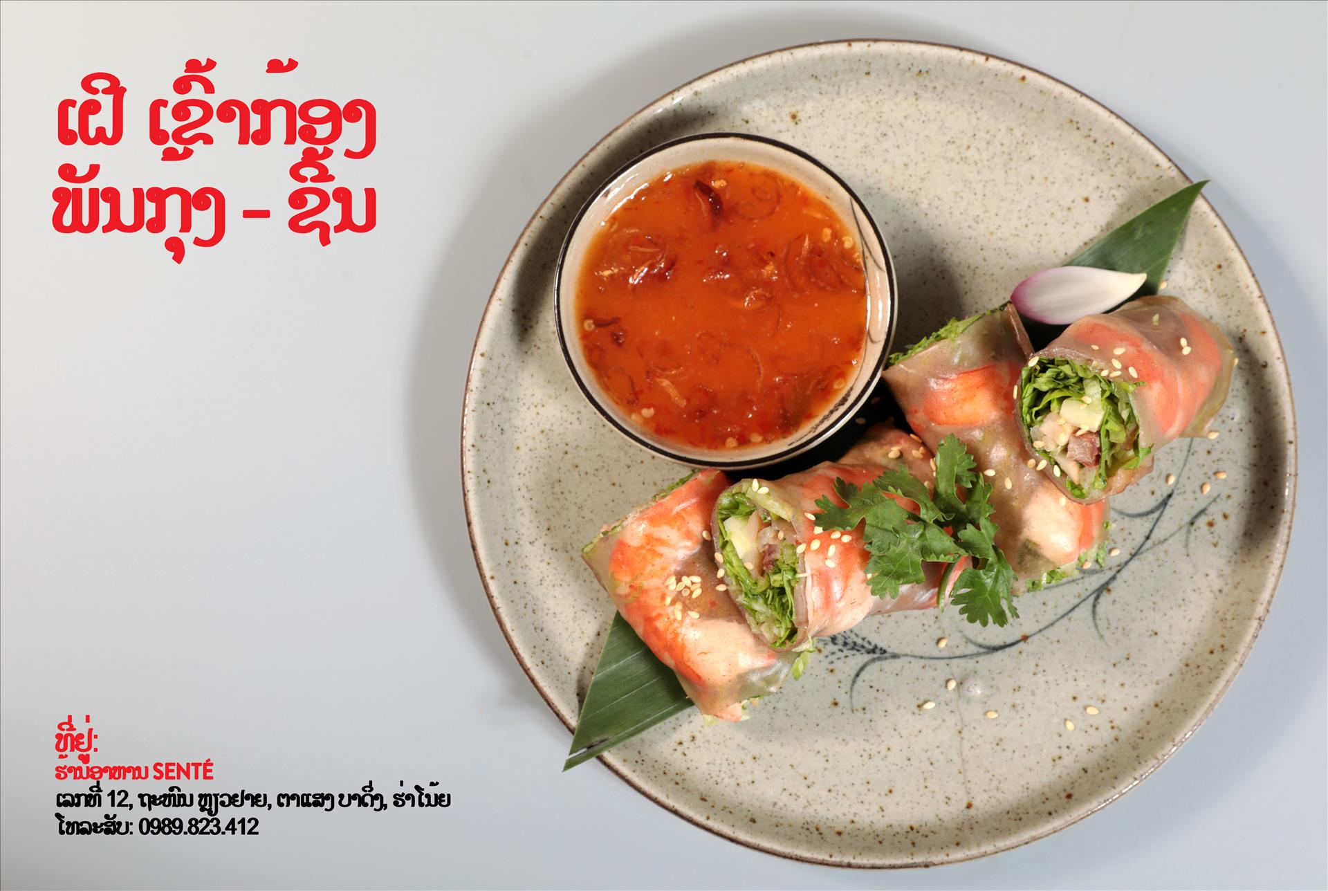 ແທນທີ່ຈະໃຊ້ແປ້ງເຝີ ສີຂາວທົ່ວໄປ, ພໍ່ຄົວຂອງຮ້ານ Senté ໄດ້ໃຊ້ ເຂົ້າກ້ອງ ເຮັດເສັ້ນເຝີ, ມີສີນ້ຳຕານ ທຳມະຊາດ, ມີຄວາມໜຽວ-ນຸ້ມ ແລະ ອຸດົມໄປດ້ວຍສານອາຫານ. ເຝີ ທີ່ເປັນແຜ່ນ ຈະຫໍ່ເອົາ ສ່ວນ ປະກອບພາຍໃນ ເຊິ່ງປະກອບດ້ວຍ ກຸ້ງຕົ້ມ ສົດ, ຊີ້ນໝູປີ້ງ, ເຫັດ ຂາ ໄກ່, ຫົວບົວ, ໝາກແຕງ ແລະ ຜັກຊີ, ສ້າງເປັນ ຄວາມກົມກຽວ ທີ່ ສົມບູນແບບ ລະຫວ່າງກິ່ນ-ສີ-ລົດຊາດ.