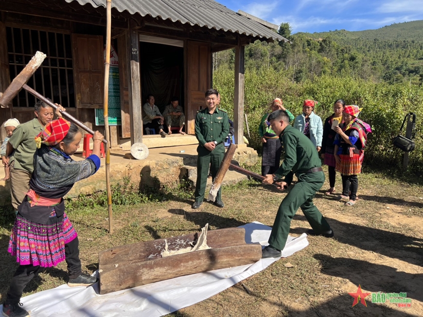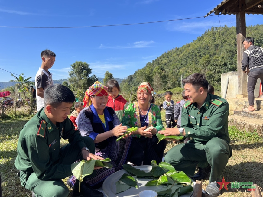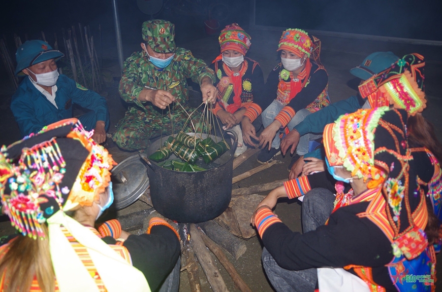 ພະນັກງານ, ນັກຮົບທະຫານຊາຍແດນ ແຂວງ ລາຍເຈົາ ຕົ້ມເຂົ້າຕົ້ມ ຕ້ອນຮັບບຸນເຕັດ ຮ່ວມກັບພໍ່ແມ່ປະຊາຊົນຢູ່ເຂດຊາຍແດນ. ພາບ: ດຶກຢ໋ວນ.