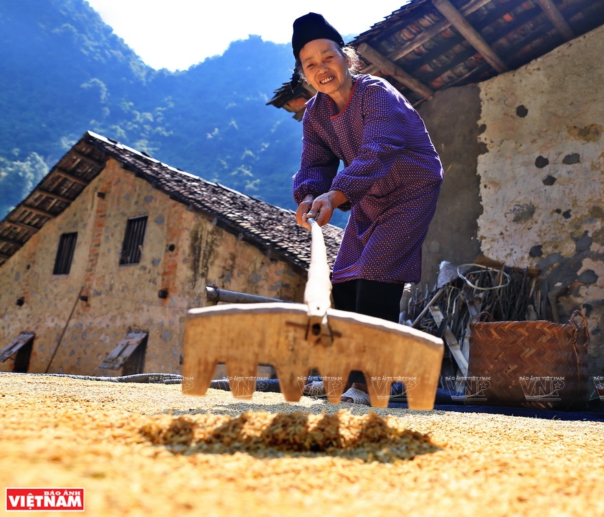 ຊາວເຜົ່າ ໄຕ່ ຢູ່ ຂວຍກີ ມີຄວາມຕິດພັນກັບຕົ້ນເຂົ້າ, ເຂົາເຈົ້າຕາກເຂົ້າເປືອກ ຢູ່ເທິງ ຫຼັງຄາເຮືອນຮ້ານດ້ວຍຫີນ ຫຼັງລະດູການເກັບກ່ຽວ. ພາບ: VNP