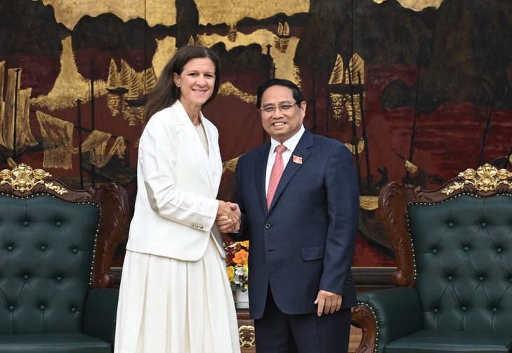 ທ່ານນາຍົກລັດຖະມົນຕີ ຫວຽດນາມ ຟ້າມມິງຈິງ ຕ້ອນຮັບທ່ານນາງ Maria Zingoni ຜູ້ອຳນວຍການຝ່າຍບໍລິຫານຮັບຜິດຊອບແຫຼ່ງໄຟຟ້າຂອງບໍລິສັດ GE Vernova