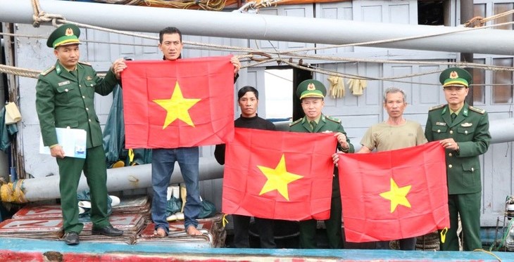ກຳລັງທະຫານມອບທຸງຊາດໃຫ້ແກ່ຊາວປະມົງກ່ອນອອກຈາກທ່າ (ພາບ: VOV)