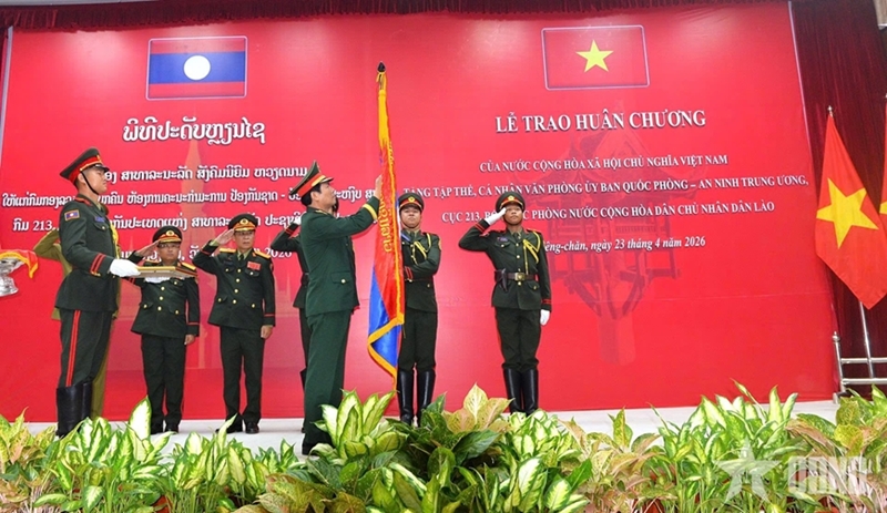 ໂດຍໄດ້ຮັບການມອບສິດຈາກປະທານປະເທດຫວຽດນາມ, ທ່ານພົນເອກ ຫງວຽນເຕິນເກືອງ ປະດັບຫຼຽນໄຊຂອງລັດຫວຽດນາມ ໃຫ້ແກ່ກົມກອງລວມໝູ່ ແລະບຸກຄົນ ຂອງກອງທັບປະຊາຊົນລາວ. ພາບ: qdnd.vn