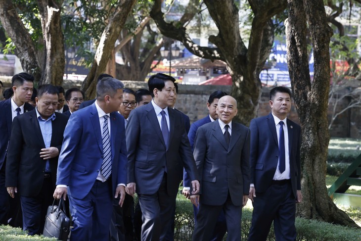 ຕອນເຊົ້າວັນທີ 29 ພະຈິກ, ທ່ານປະທານປະເທດ ຫວຽດນາມ ເລືອງເກື່ອງ ແລະ ພະບາດສົມເດັດພະບໍລົມມະນຽດມະຫາກະສັດ Norodom Sihamoni ແຫ່ງລາຊະອານາ ຈັກກຳປູເຈຍ ໄດ້ໄປຢ້ຽມຢາມເຂດ ວັນມຽວ - ກວັກຕືຢາມ ແລະ ດື່ມນ້ຳຊາ ຫວຽດນາມ.