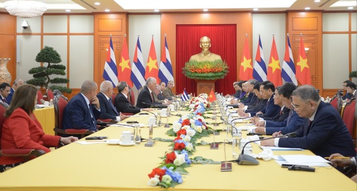 ພາຍຫຼັງພິທີຕ້ອນຮັບ, ທ່ານເລຂາທິການໃຫຍ່ ໂຕເລີມ ໄດ້ມີການເຈລະຈາກັບທ່ານເລຂາທີ1 ຄະນະບໍລິຫານງານສູນກາງພັກກອມມູນິດກູບາ ປະທານປະເທດ ກູບາ Miguel Díaz-Canel Bermúdez ເພື່ອສືບຕໍ່ປຶກສາຫາລືກ່ຽວກັບທິດທາງການຮ່ວມມືລະຫວ່າງ 2 ປະເທດໃຫ້ນັບມື້ນັບແທດຈິງ ແລະ ມີປະສິດທິຜົນໃນໄລຍະຈະມາເຖິງ. ກ່າວຄຳເຫັນໄຂການເຈລະຈາ, ທ່ານເລຂາທິການໃຫຍ່ ໂຕເລີມ ເນັ້ນໜັກວ່າ: