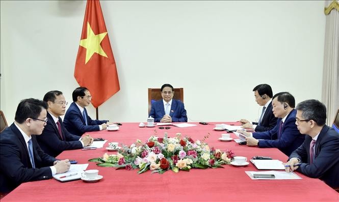 ທ່ານນາຍົກລັດຖະມົນຕີ ຟ້າມມິງຈິງ ໂອ້ລົມທາງໂທລະສັບກັບ ທ່ານນາຍົກລັດຖະມົນຕີ ສິງກະໂປ Lawrence Wong (ພາບ: TTXVN)
