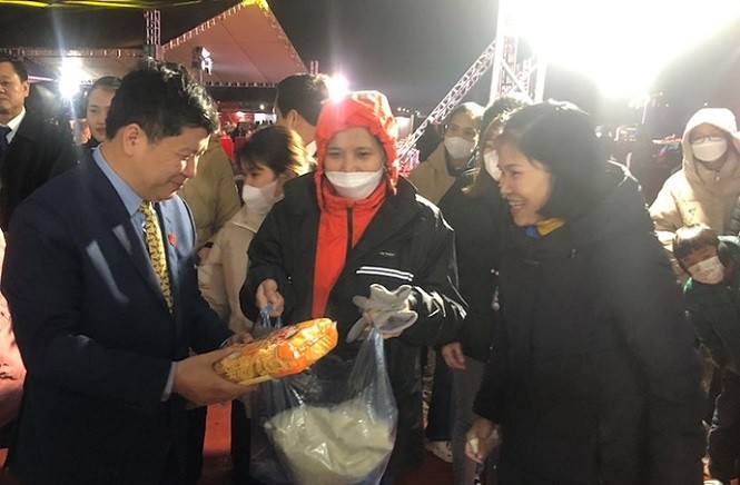 ຕອນຄ່ຳວັນທີ 27 ມັງກອນ, ຢູ່ແຂວງ ບັກຢາງ, ສະຫະພັນແຮງງານແຂວງ ໄດ້ໄຂລາຍການ “ບຸນເຕັດເຕົ້າໂຮມ - ລະດູບານໃໝແຫ່ງການແບ່ງປັນ” ຕິດພັນກັບຕະຫຼາດບຸນເຕັດກະມະບານ, ຮ້ານຂາຍເຄື່ອງ 0 ດົ່ງທີ່ສະຫງວນໃຫ້ກຳມະກອນຜູ້ອອກແຮງງານຢູ່ເຂດອຸດສາຫະກຳ ກວາງເຈົາ (ເມືອງ ຫວຽດອຽນ).