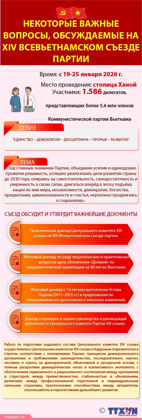 Под девизом «Демократия, дисциплина, прорыв, развитие» XIV съезда КПВ официально проходит в столице Ханое с 19 по 25 января 2026 года.