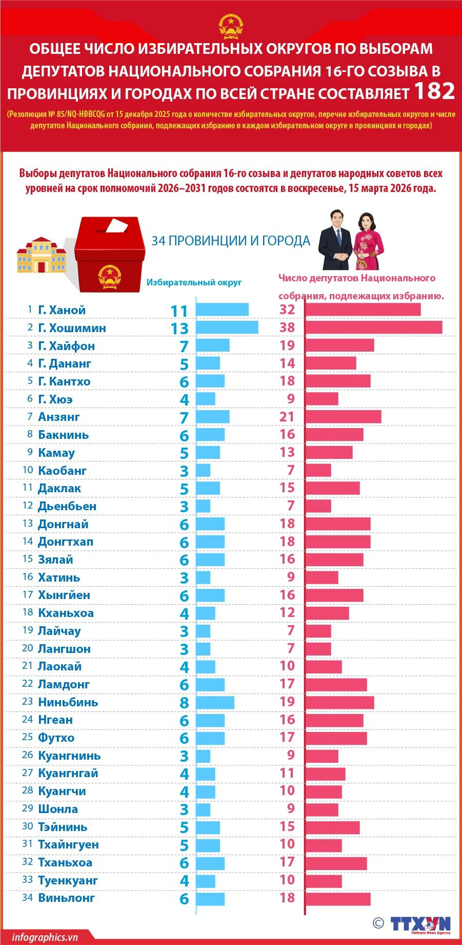 В масштабах всей страны насчитывается 182 избирательных округа для 16-го созыва Национального собрания. Пять населенных пунктов с наибольшим числом делегатов Национального собрания — это Хошимин (38 делегатов, 13 избирательных округов), Ханой (32 делегата, 11 избирательных округов), Анзянг (21 делегат, 7 избирательных округов), Хайфон (19 делегатов, 7 избирательных округов) и Ниньбинь (19 делегатов, 8 избирательных округов).