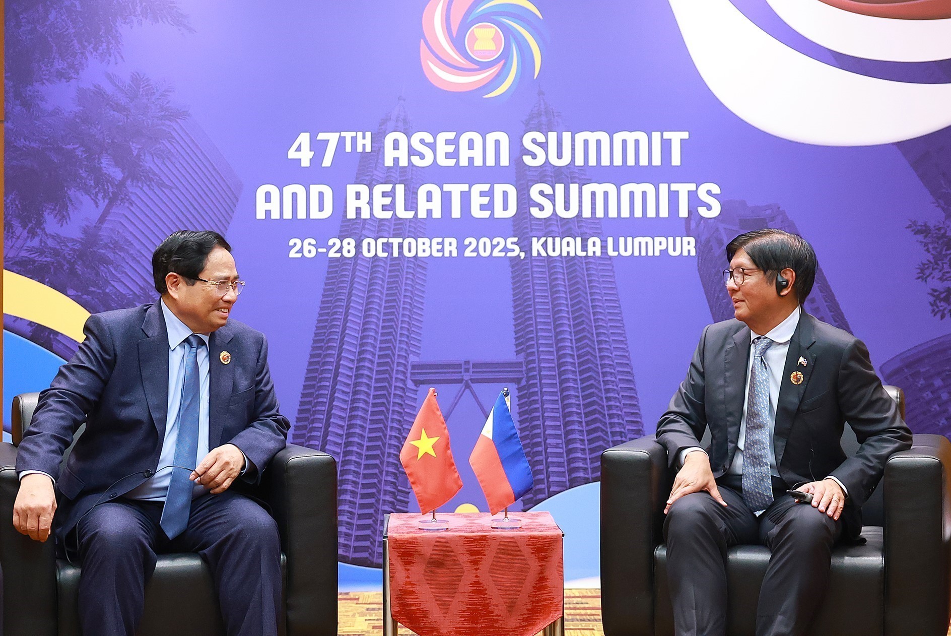 Премьер-министр Фам Минь Тьинь (слева) встречается с Президентом Филиппин Фердинандом Ромвальдесом Маркосом-младшим в Малайзии 27 октября 2025 года. Фото: ВИA