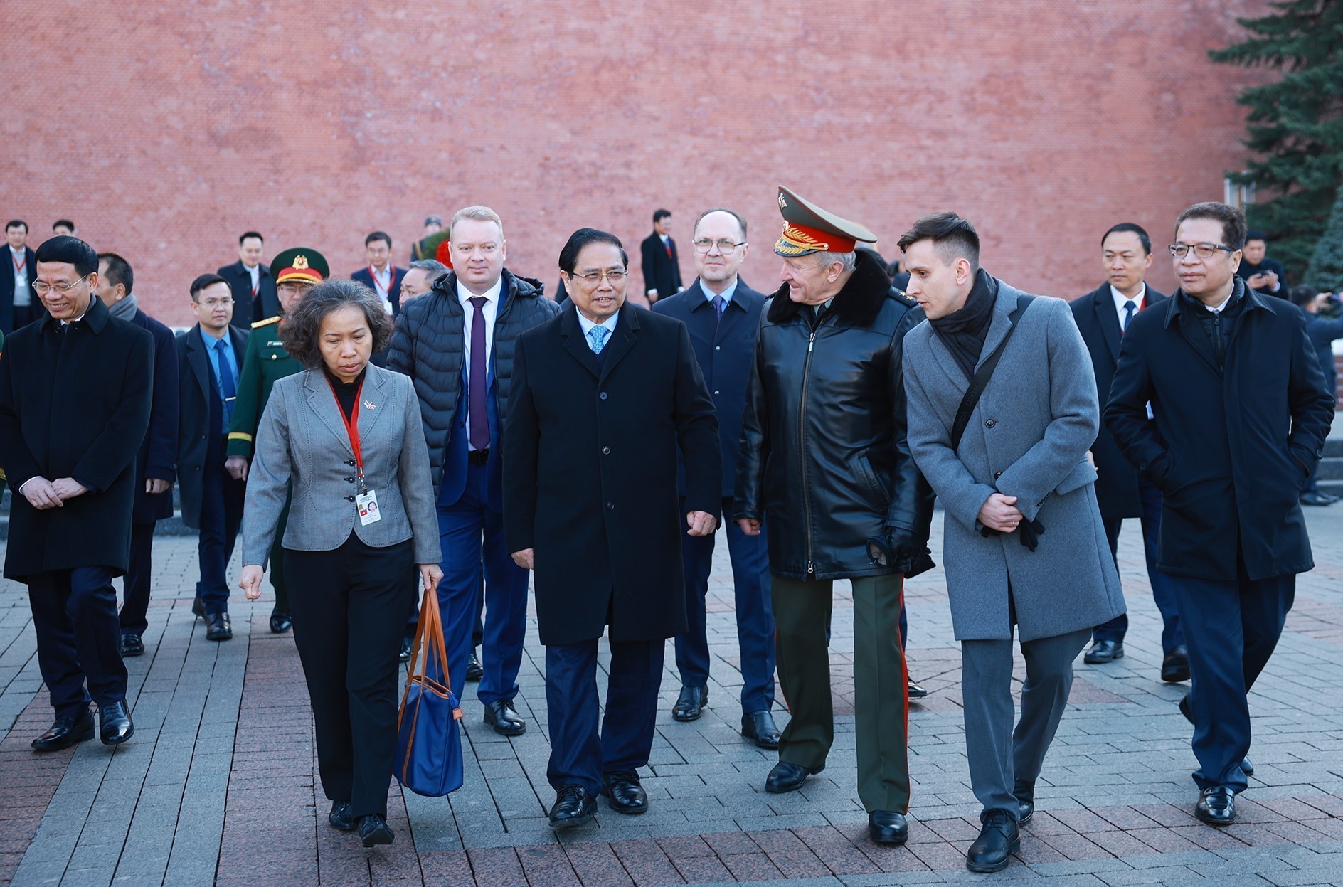 Возлагая цветы к памятнику Президенту Хо Ши Мину, премьер-министр Фам Минь Тьинь и делегация с глубоким почтением склоняют головы в память о Президенте Хо Ши Мине — великом лидере, национальном герое, мировом культурном деятеле, основателе первых дружеских отношений между народами Вьетнама и Советского Союза, ныне РФ; они выражают намерение всегда сохранять и развивать искренние чувства к стране и народу России, строить отношения между Вьетнамом и РФ все более глубокими, содержательными, прочными и эффективными.