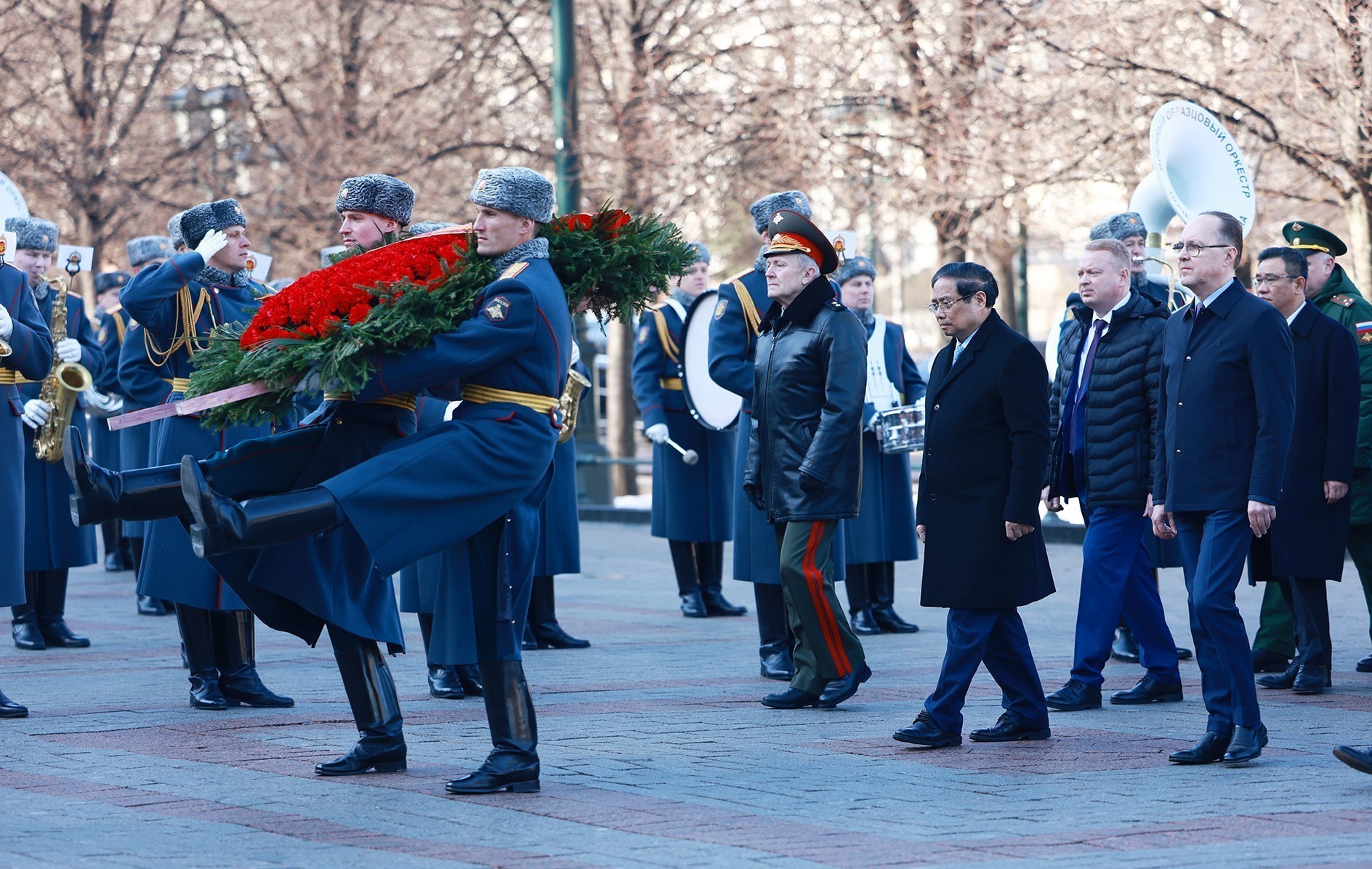 Премьер-министр Фам Минь Чинь и его делегация возложили венки к памятнику Неизвестному солдату в Александровском саду на западной стене Кремля. Фото: ВИА