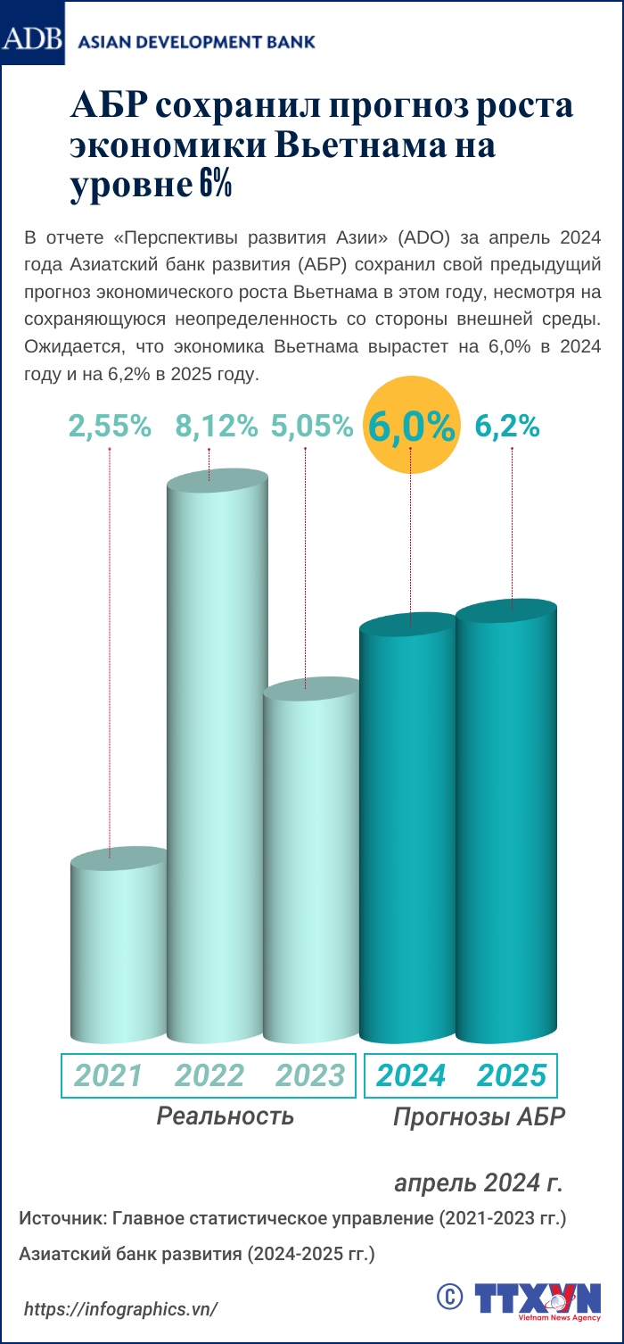 Азиатский банк развития (АБР) заявил, что сохранил свой предыдущий прогноз роста во Вьетнаме на этот год, несмотря на сохраняющуюся неопределенность во внешней среде. Ожидается, что экономика Вьетнама вырастет на 6,0% и 6,2% в 2024 и 2025 годах соответственно.