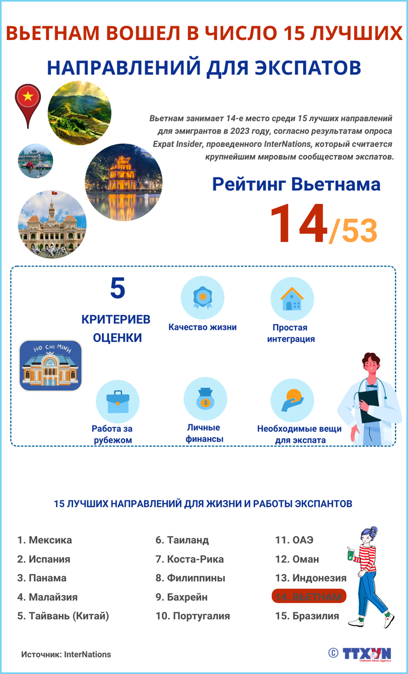 Вьетнам занимает 14-е место среди 15 лучших направлений для эмигрантов в 2023 году, согласно результатам опроса Expat Insider, проведенного InterNations, который считается крупнейшим мировым сообществом экспатов.