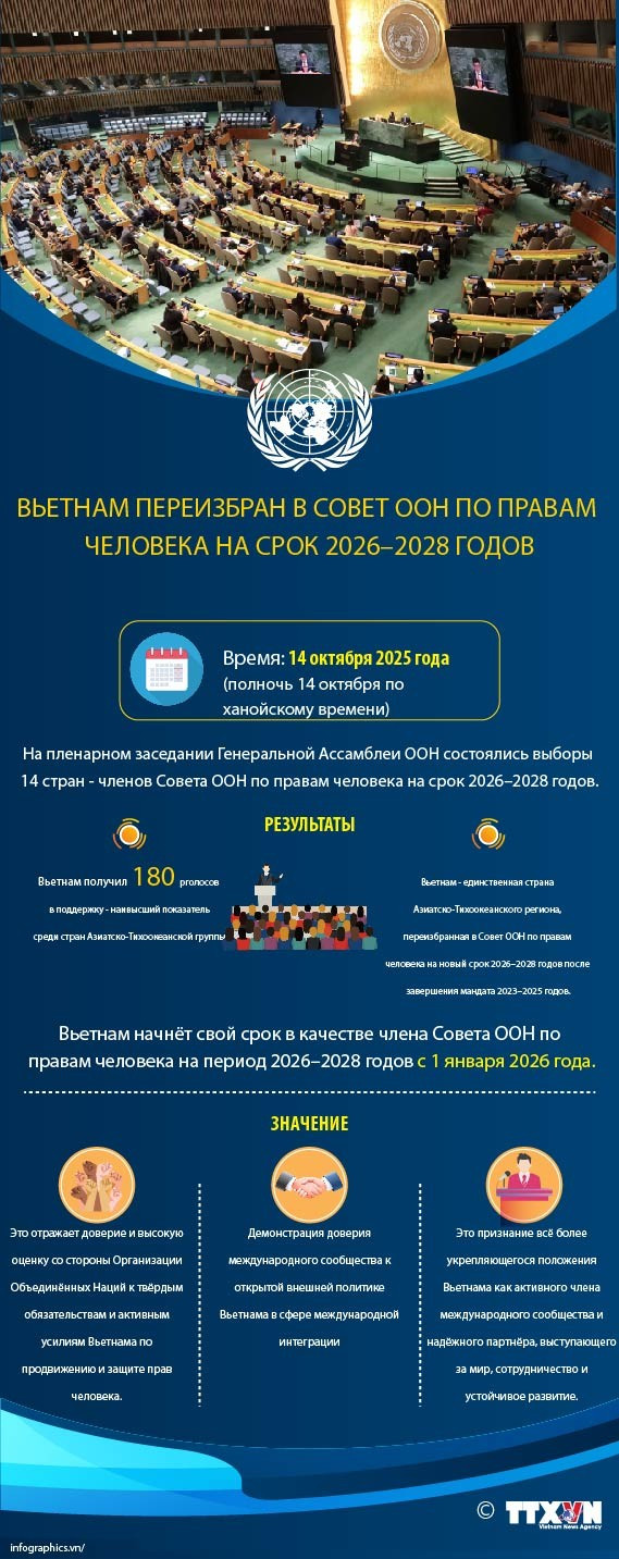 14 октября (по нью-йоркскому времени) Генеральная Ассамблея Организации Объединенных Наций избрала членов Совета по правам человека ООН (СПЧ) на срок 2026–2028 годов, в котором Вьетнам был переизбран 180 голосами «за», что является самым высоким показателем в Азиатско-Тихоокеанской группе.