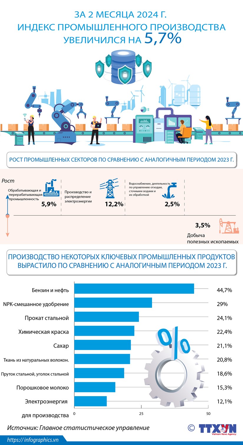 За первые 2 месяца 2024 года индекс промышленного производства увеличился на 5,7%