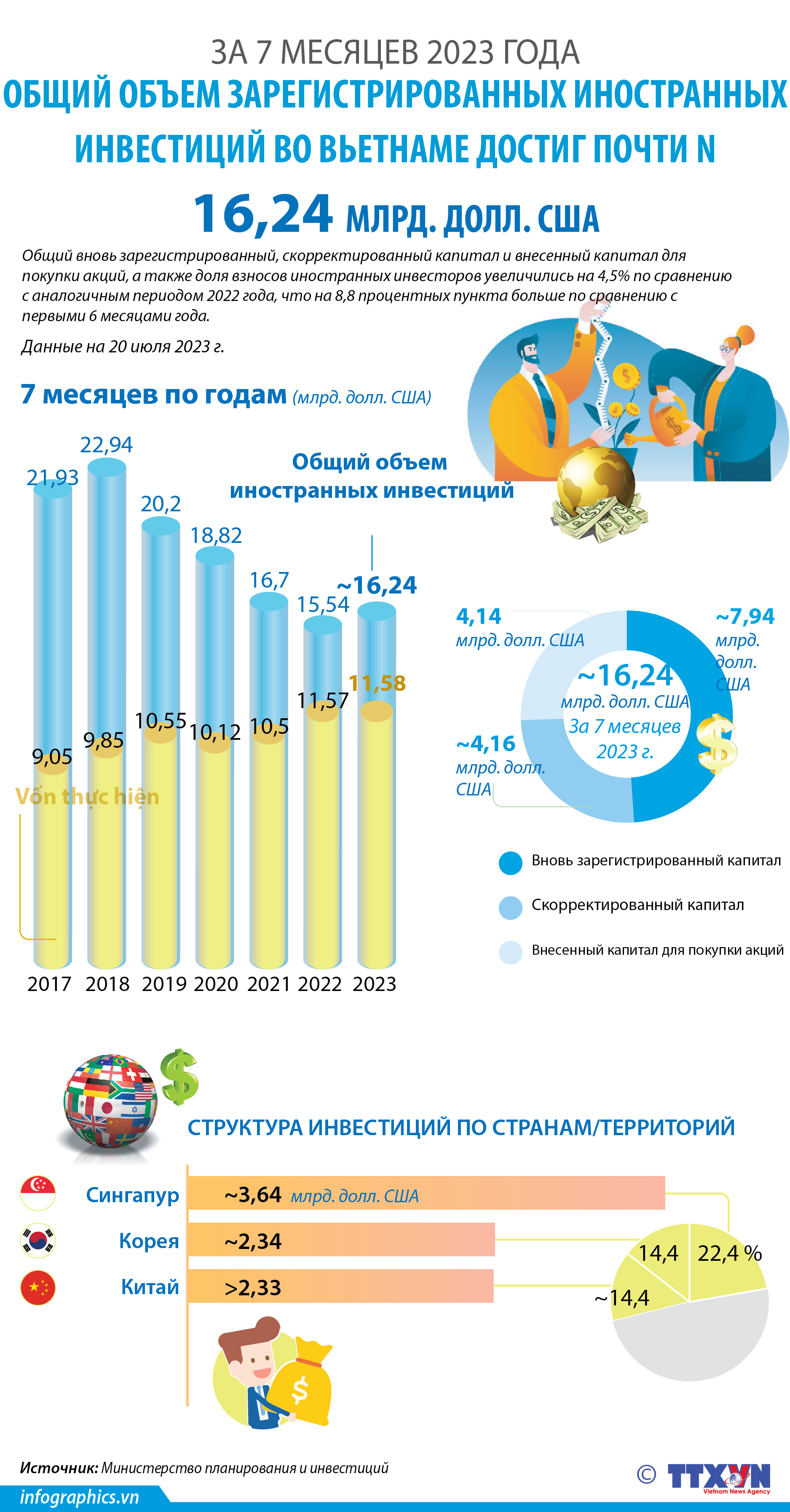 За 7 месяцев 2023 г. общий объем зарегистрированных иностранных инвестиций во Вьетнаме достиг почти 16,24 млрд. долл. США