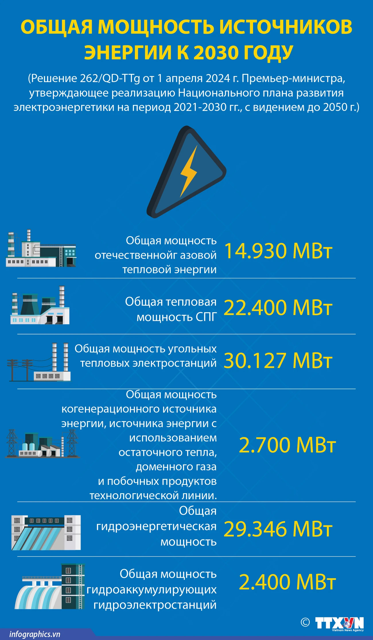 Решение 262/QD-TTg от 1 апреля 2024 г. Премьер-министра, утверждающее реализацию Национального плана развития электроэнергетики на период 2021-2030 гг., c видением до 2050 г.)