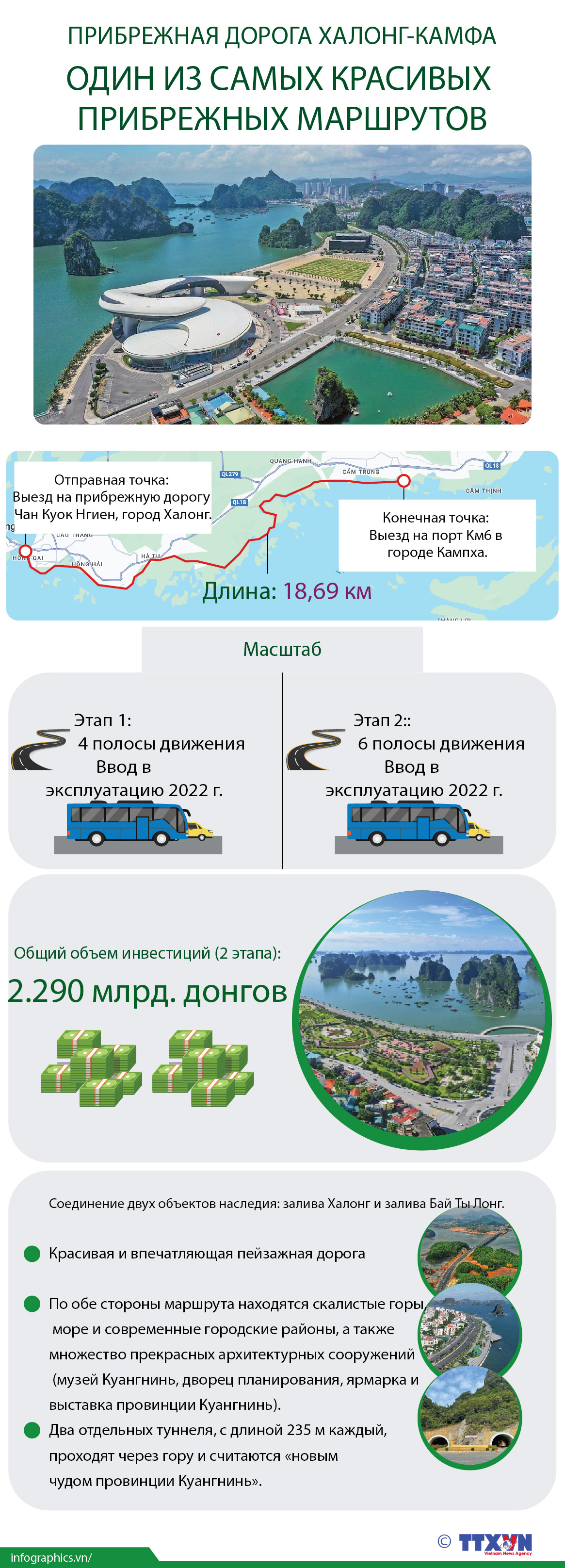 Прибрежная дорога Халонг – Камфа в провинции Куангнинь имеет общую длину 18,7 км и 6 полос движения. Это считается самой красивой прибрежной дорогой во Вьетнаме, с красивыми и впечатляющими пейзажами, по обе стороны маршрута — скалистые горы, море и современные городские районы.
