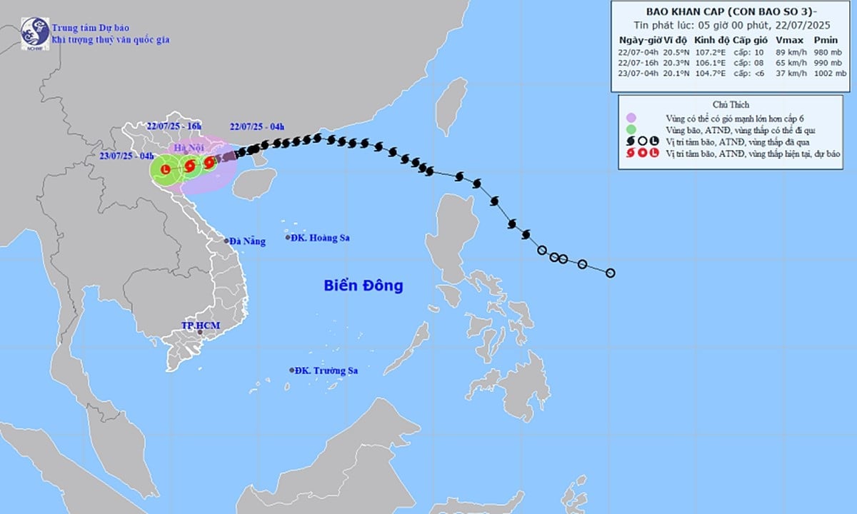 Согласно прогнозу, к 16:00 22 июля на участке от Хайфона до Тханьхоа ожидается сильный ветер силой до 8 баллов, порывы до 10 баллов. Предполагается, что в ранние часы 23 июля тайфун выйдет вглубь суши и ослабнет до области низкого давления на границе между Вьетнамом и Лаосом.