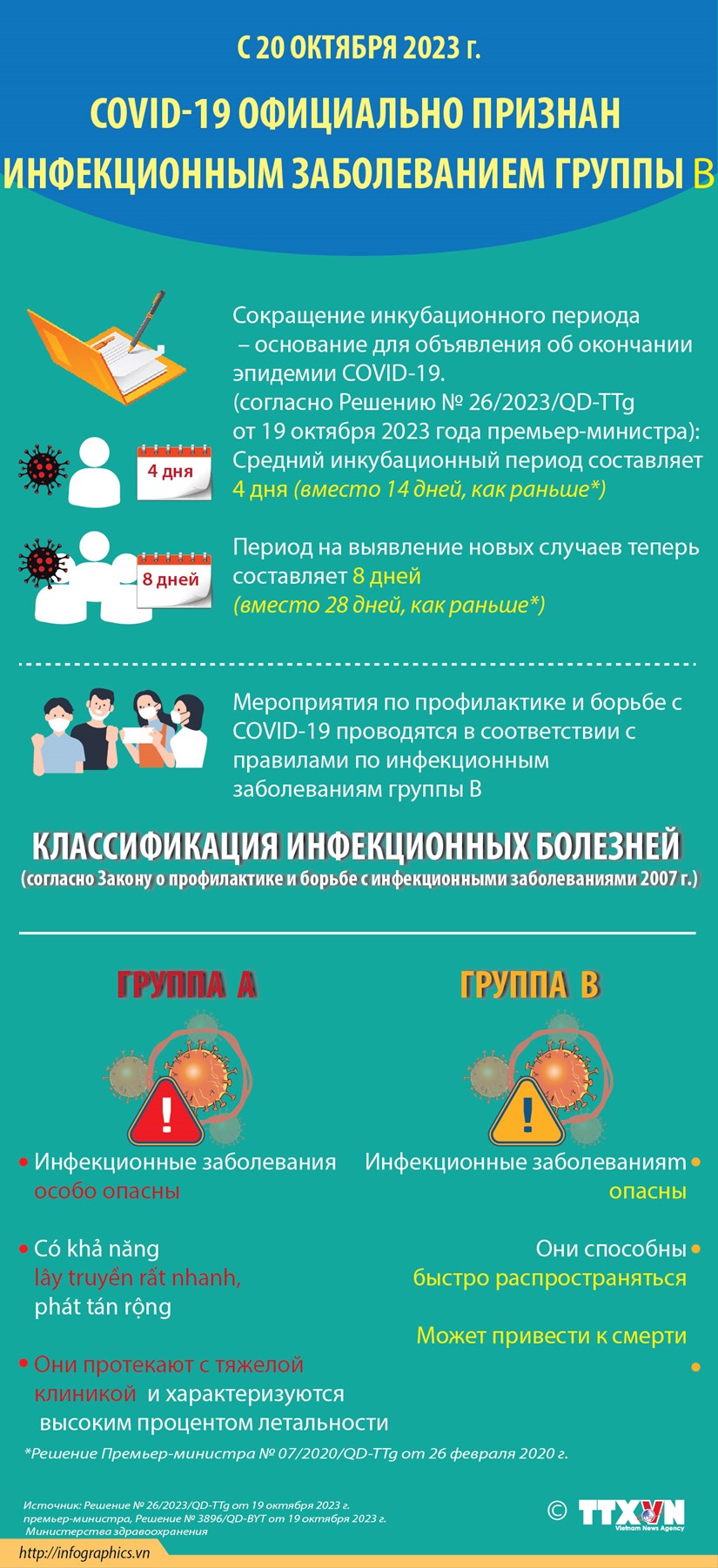 Согласно Решению Премьер-министра № 26/2023/QD-TTg от 19 октября, с 20 октября COVID-19 больше не относится к инфекционному заболеванию группы А, а переходит в группу В.