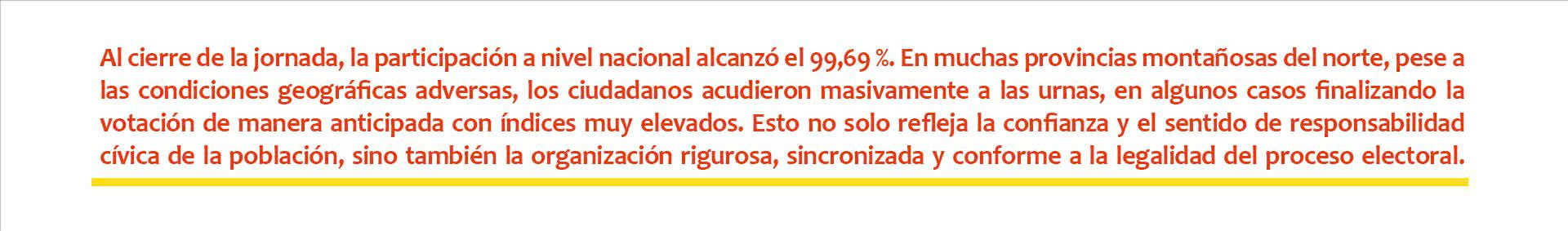 Al cierre de la jornada, la participación a nivel nacional alcanzó el 99,69 %. En muchas provincias montañosas del norte, pese a las condiciones geográficas adversas, los ciudadanos acudieron masivamente a las urnas, en algunos casos finalizando la votación de manera anticipada con índices muy elevados. Esto no solo refleja la confianza y el sentido de responsabilidad cívica de la población, sino también la organización rigurosa, sincronizada y conforme a la legalidad del proceso electoral.
