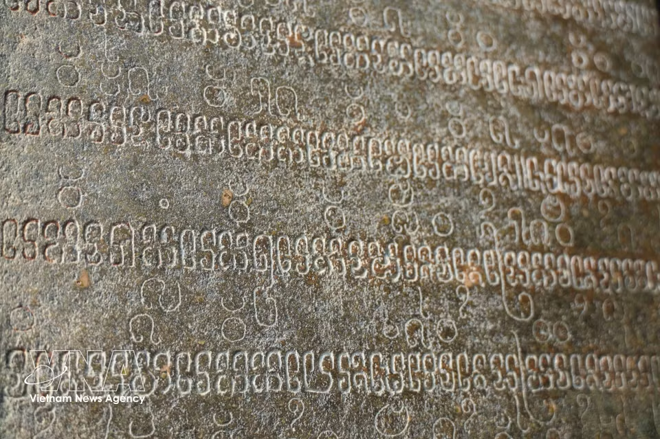 La columna exterior de la entrada de la torre principal está grabada con antiguos caracteres de la etnia Charn. (Foto: VNA)
