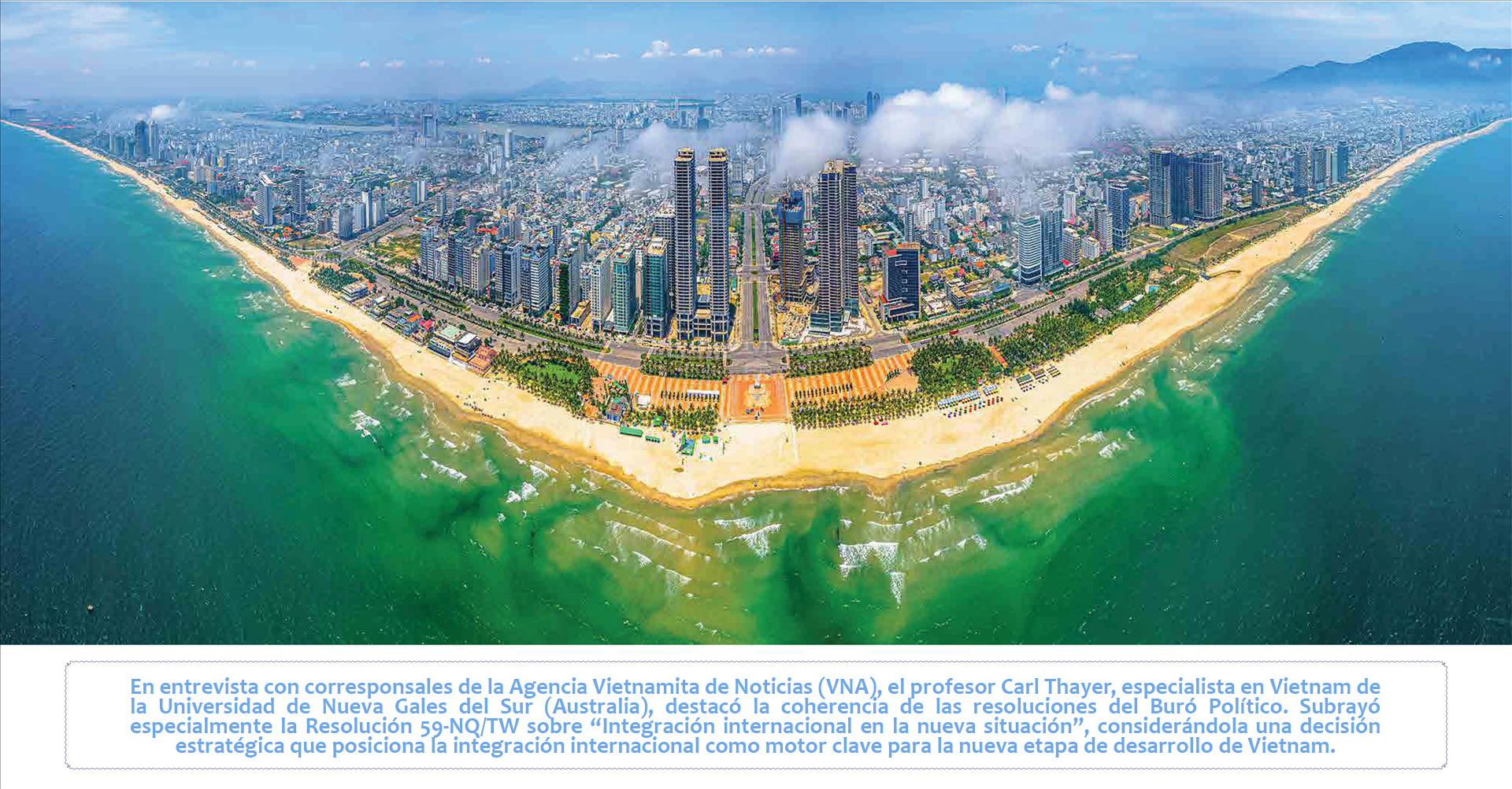 En entrevista con corresponsales de la Agencia Vietnamita de Noticias (VNA), el profesor Carl Thayer, especialista en Vietnam de la Universidad de Nueva Gales del Sur (Australia), destacó la coherencia de las resoluciones del Buró Político. Subrayó especialmente la Resolución 59-NQ/TW sobre “Integración internacional en la nueva situación”, considerándola una decisión estratégica que posiciona la integración internacional como motor clave para la nueva etapa de desarrollo de Vietnam.