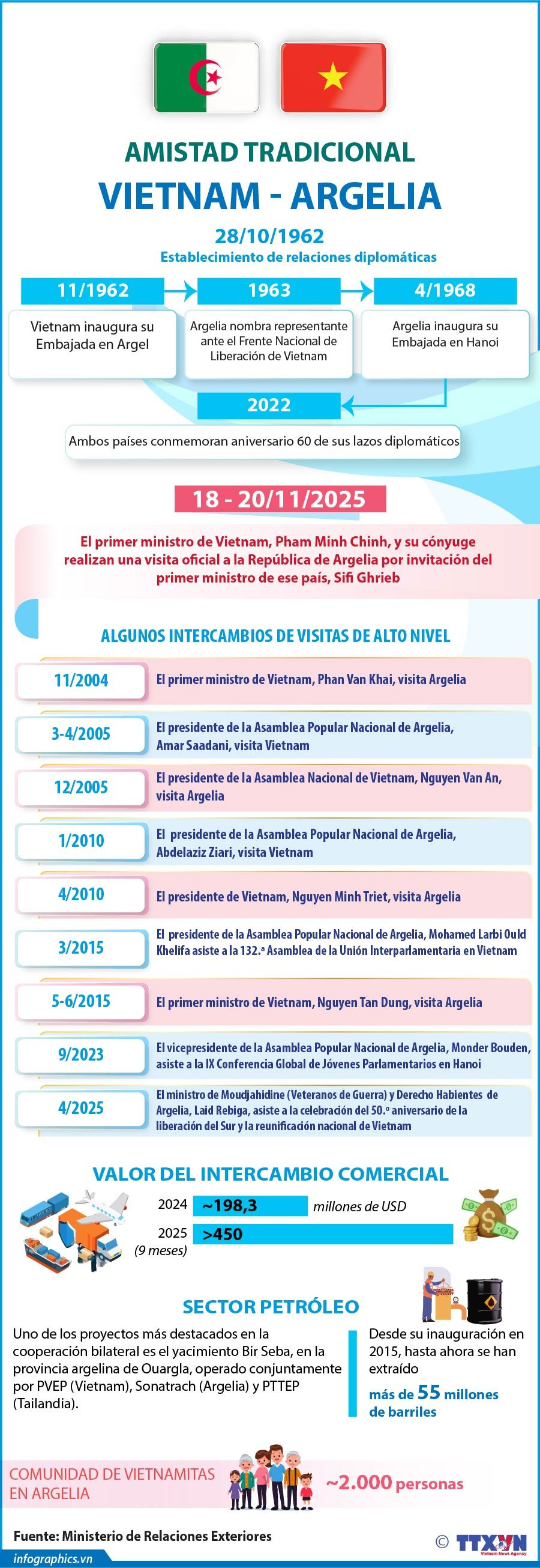 El primer ministro de Vietnam, Pham Minh Chinh, acompañado de su cónyuge y de una delegación de alto nivel, realiza del 18 al 20 de noviembre una visita oficial a Argelia, invitado por su homólogo anfitrión, Sifi Ghrieb.