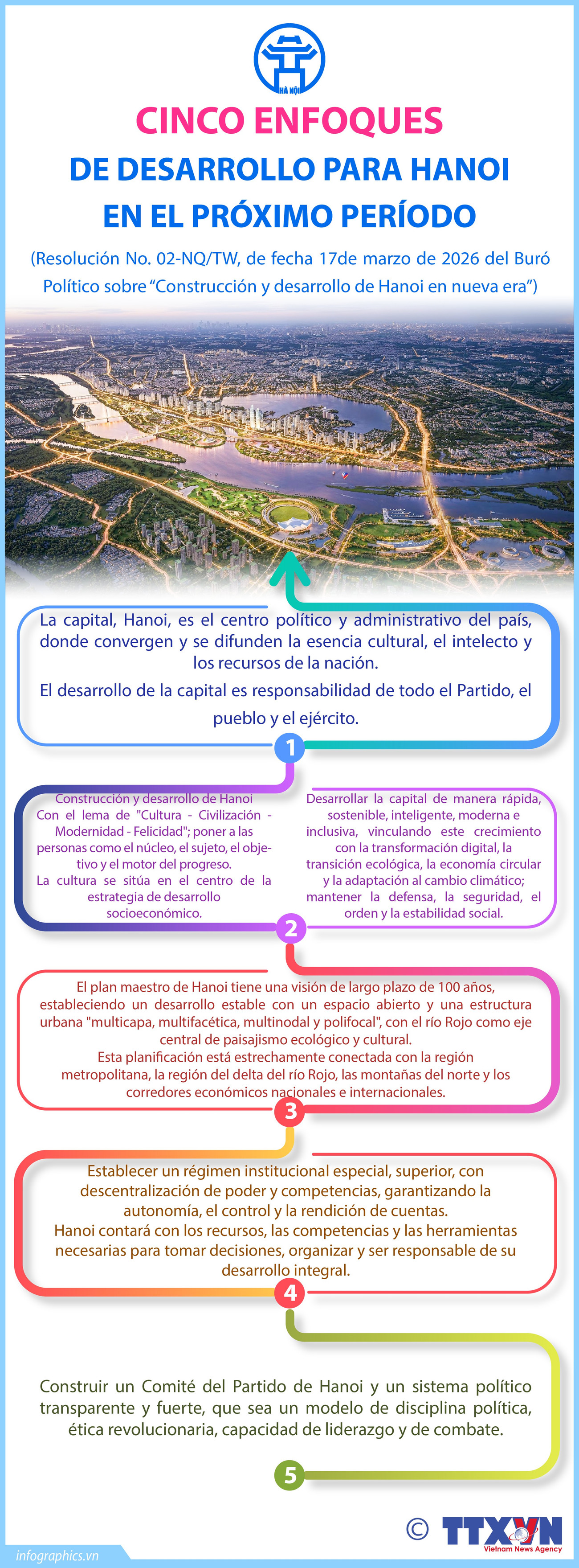 El 17 de marzo de 2026, el secretario general del Partido, To Lam, firmó y promulgó la Resolución 02-NQ/TW del Buró Político sobre "Construir y desarrollar Hanoi en la nueva era". Con base en una evaluación de la situación actual de Hanoi en los últimos años, la Resolución establece cinco orientaciones de desarrollo para la capital en el próximo período.