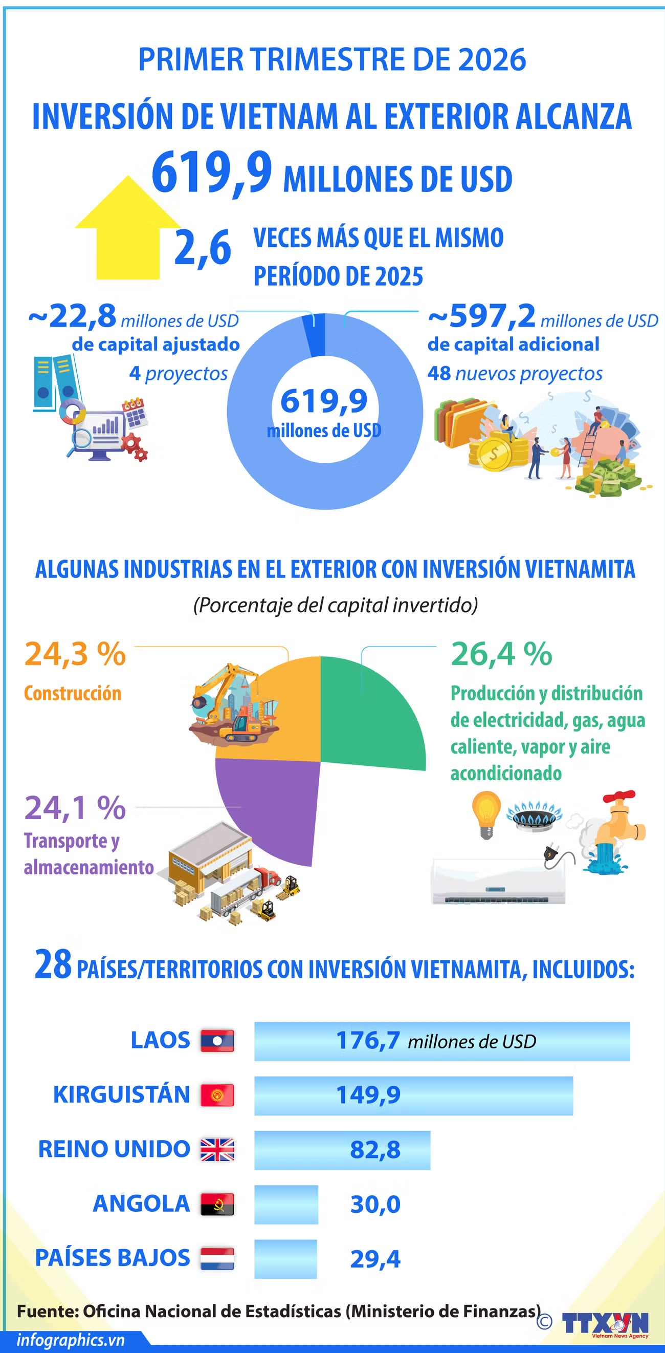 Economía Crece inversión de Vietnam al exterior en primer trimestre de 2026 27/04/2026 La inversión de Vietnam al exterior alcanzó 619,9 millones de dólares en el primer trimestre del año, 2,6 veces más que el mismo lapso de 2025. VNA/VNP