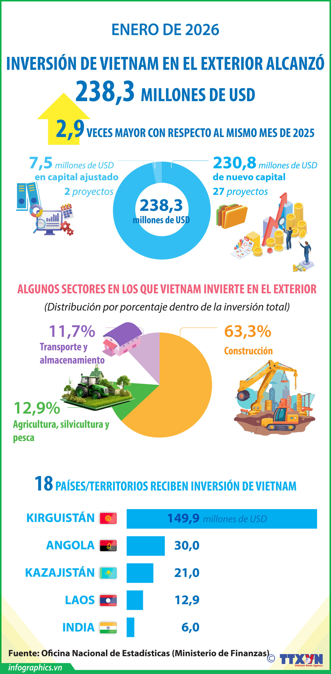 La inversión de Vietnam en el extranjero alcanzó los 238,3 millones de USD, casi tres veces más que en el mismo período de 2025. De esta cifra, 150,9 millones (63,3%) se destinaron a la construcción, 30,7 millones (12,9%) a la agricultura, silvicultura y pesca, y 27,9 millones (11,7%) al transporte y almacenamiento.