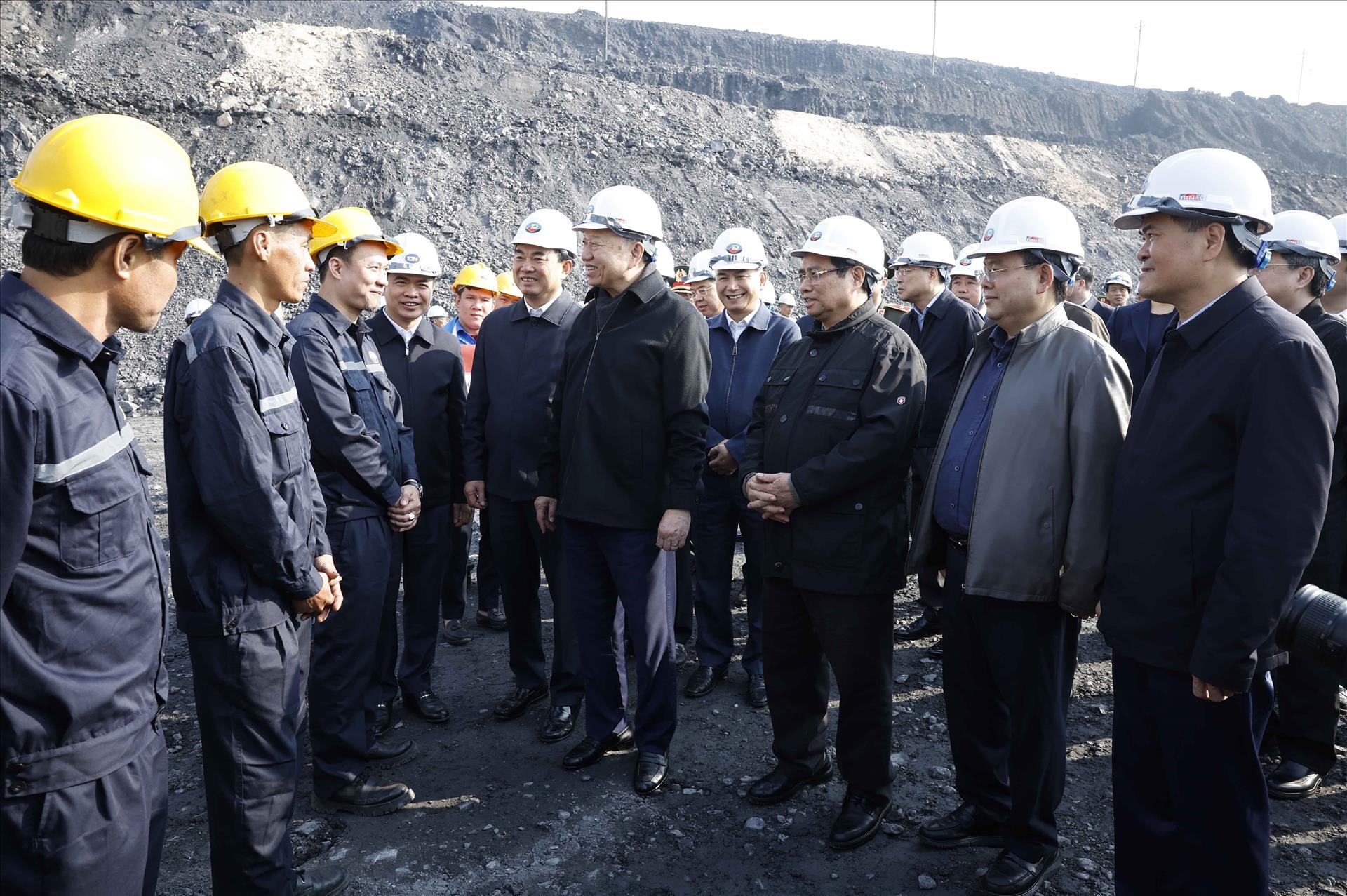 El secretario general del Partido Comunista de Vietnam, To Lam y el primer ministro Pham Minh Chinh, junto con una delegación del Comité Central, transmitieron hoy sus felicitaciones por el Tet a los trabajadores del sector del carbón. Foto: Thong Nhat - VNA