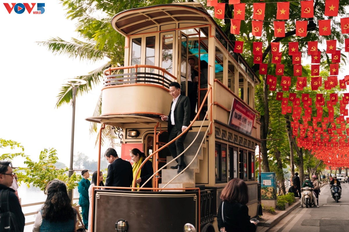 Turistas hacen un paseo por Hanói en la tranvía con entusiasmo. (Foto: Kim Lieu/VOV5) |