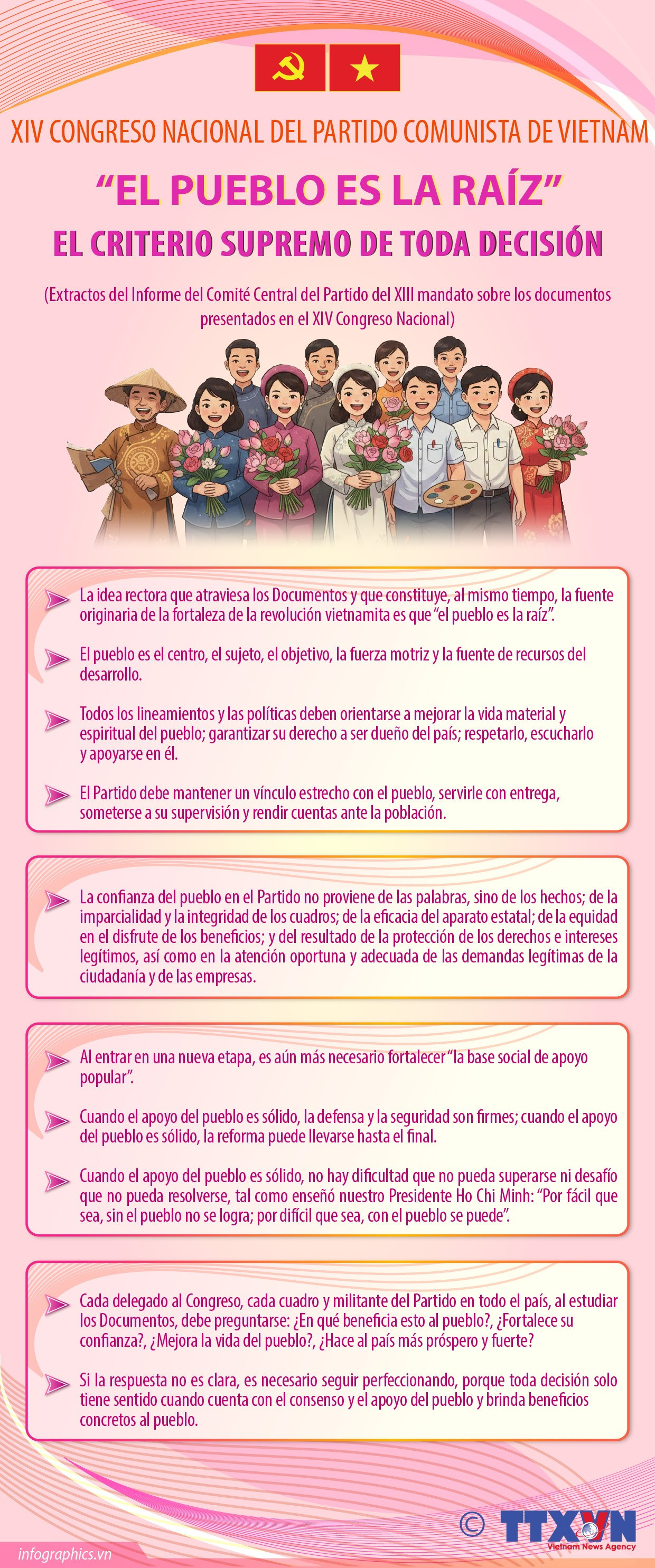 El Partido Comunista de Vietnam reafirma que el pueblo es el centro del desarrollo, la fuerza motriz de la revolución y la base de la confianza y la prosperidad nacional.
