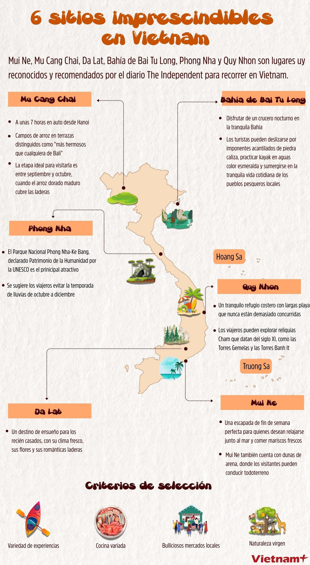 Mui Ne, Mu Cang Chai, Da Lat, Bahía de Bai Tu Long, Phong Nha y Quy Nhon son lugares muy reconocidos y recomendados por el diario The Independent para recorrer en Vietnam.