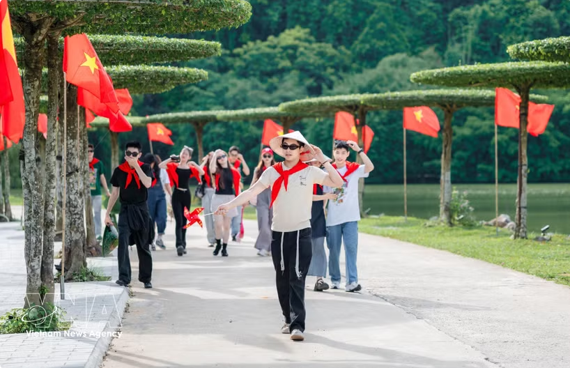 Turistas extranjeros entusiasmados en su viaje de descubrimiento de la belleza de Tuyen Quang. Foto: Duc Tho - VNA.