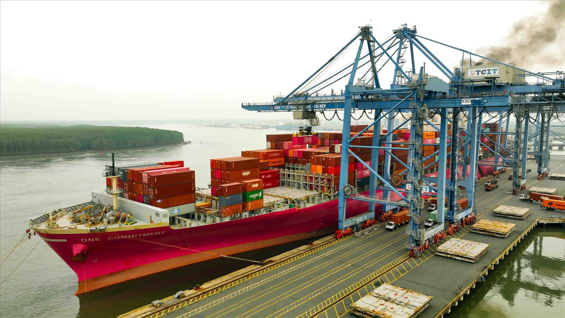 Actividades de carga y descarga de mercancías de exportación en el puerto internacional de contenedores de Tan Cang - Cai Mep, barrio de Tan Phuoc, Ciudad Ho Chi Minh. Foto: Vu Sinh – VNA